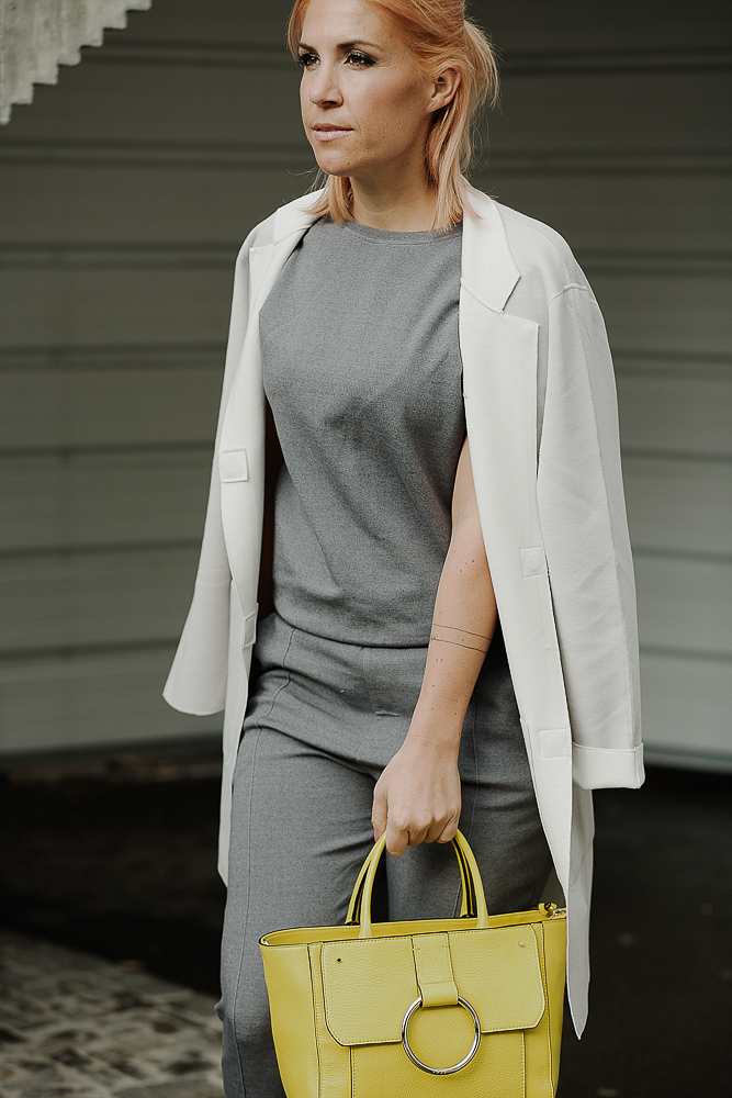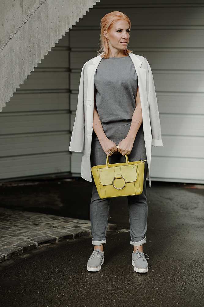 You can hardly fail with grey. Create a colorfulness with different shades of grey. Maybe not fifty but already with three you are part of the game! I totally love to combine different shades of grey with neon, or one strong bright color. It is essential that you use only one extra color apart from grey. Today I have chosen a bright yellow bag of Coccinelle, combined with a comfortable overall and coat from the dutch brand Yaya and those shoes from Marc O’Polo…it was love at the first sight! The color element can be anything, a fancy nail color, a belt, a lipcolor, the shoes, a shirt.