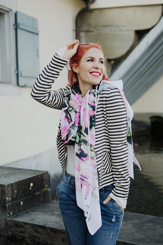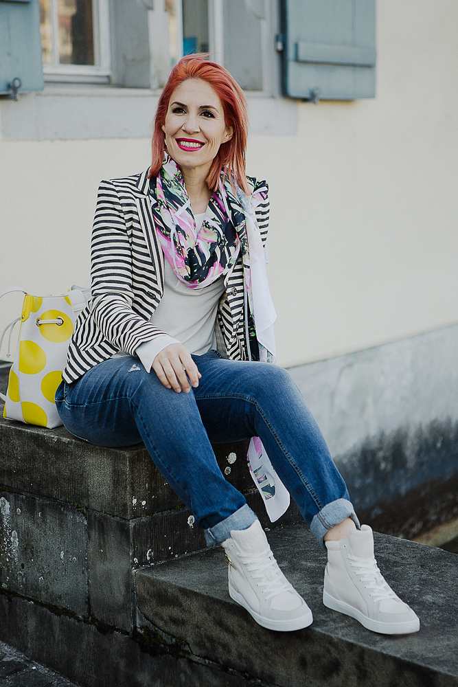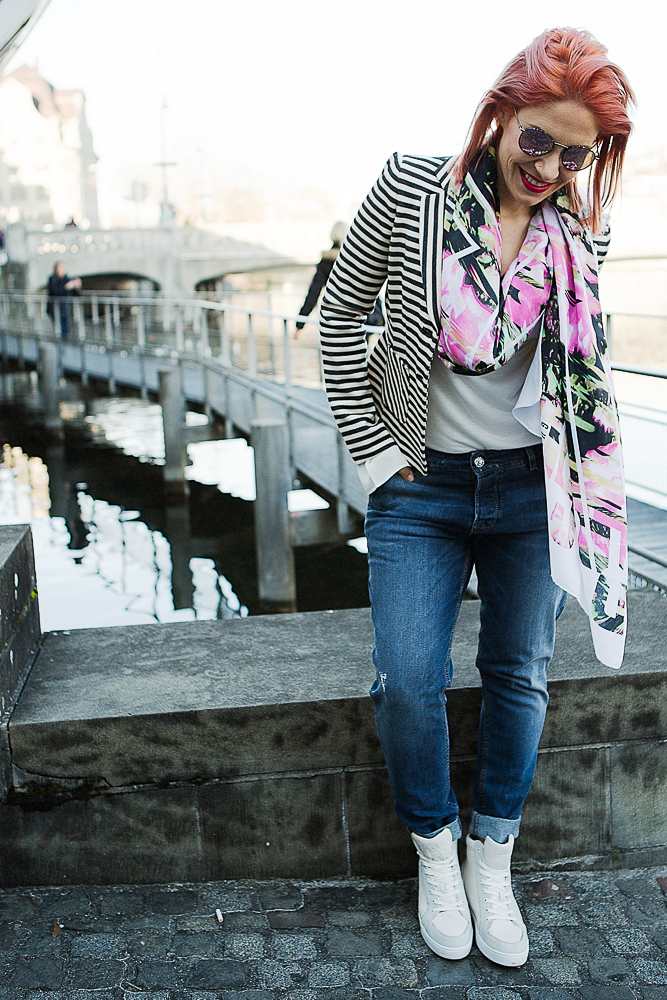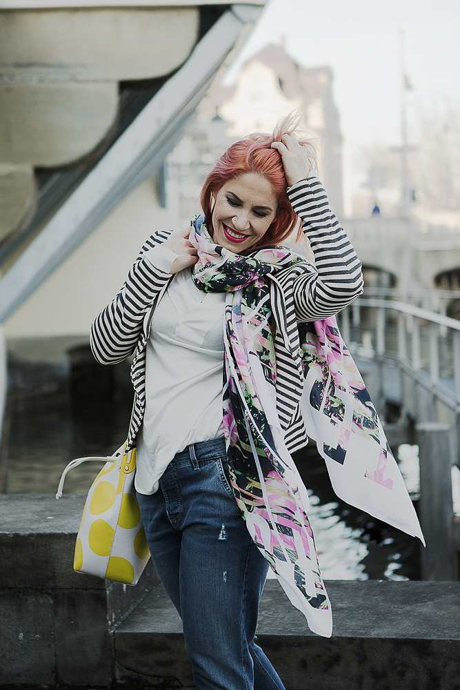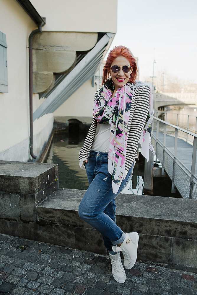 The look of the week is colorful in order to cheer you up a little bit; I heard it is raining a lot in Switzerland. I was always of the opinion that boyfriend jeans don’t look good on me. Alma, the Store Manager of The Gallery taught me otherwise and showed me this stunning pair of jeans by Liu Jo. You can see that I am having a great time with this outfit. The colors, the mix of patterns, all are happy makers, aren’t they?