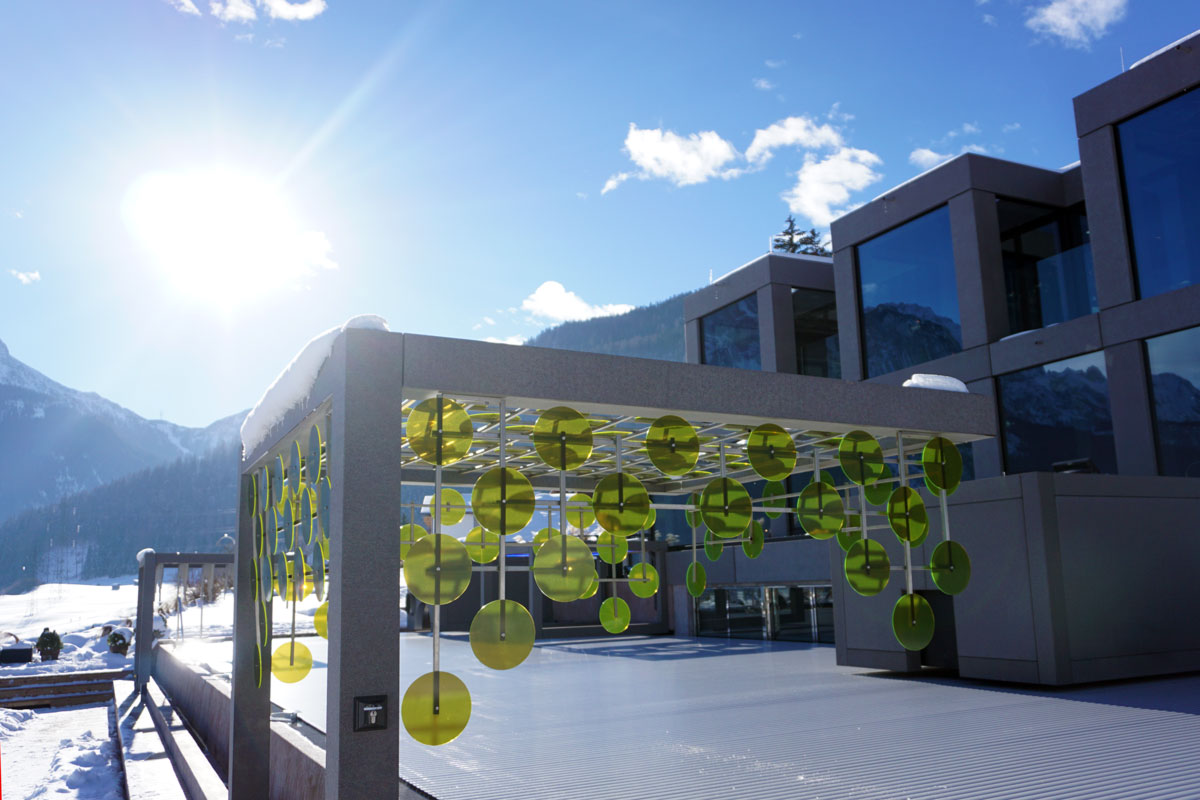 Da wär zum Beispiel eine grosszügig gestaltete Sauna, mit Blick ins Weite oder der einladende Outdoor-Infinitypool (auf dem Bild noch geschlossen, da ich es am Morgen geschossen habe) mit verschiedenen Licht- und Klangelementen.