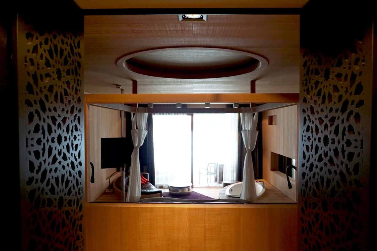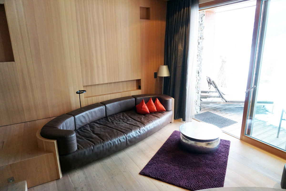 Ein begehbarer Kleiderschrank, eine Kaffee-Ecke, ein riesiges Badezimmer, ein bequemes Bett, und dann drei Stufen weiter unten eine Badewanne mit Sicht auf die Zugspitze, ein XXL-Sofa und eine grosse Terrasse. Das Interieur ist leicht orientalisch angehaucht, und entspricht genau meinem Geschmack. Am liebsten würde ich das Zimmer gleich mit nach Zürich nehmen!