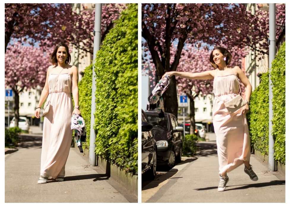 They said it’ll rain. This is not true! Blue sky and the cherry trees in full bloom! This makes me feel like dancing, laughing and jumping around! And I love to combine sneakers with dresses! What do you think about that? Do or Don’t? I personally enjoy breaking an elegant look with a grungy or sporty sneaker and a casual light jacket.