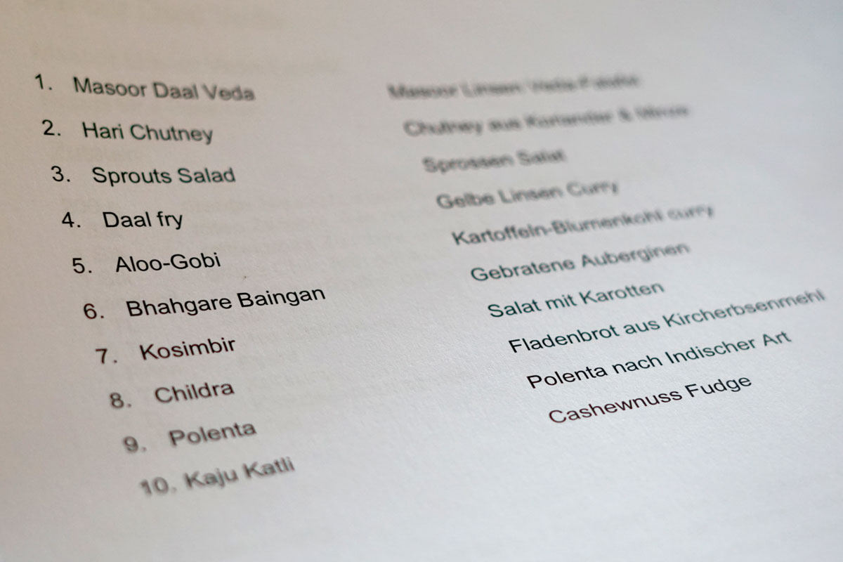 Von den zehn Rezepten fällt unsere Wahl auf die Mansoor Linsen, ein Hari Chutney, einen Sprossensalat, gebratene Auberginen, ein Kartoffel-Blumenkohl-Curry, einen Karottensalat, Fladenbrot, und zum Dessert ein Cashnewnut Fuge.