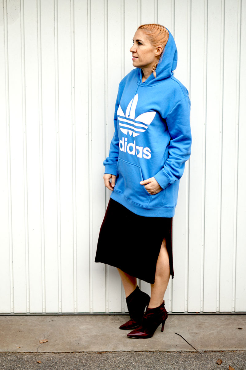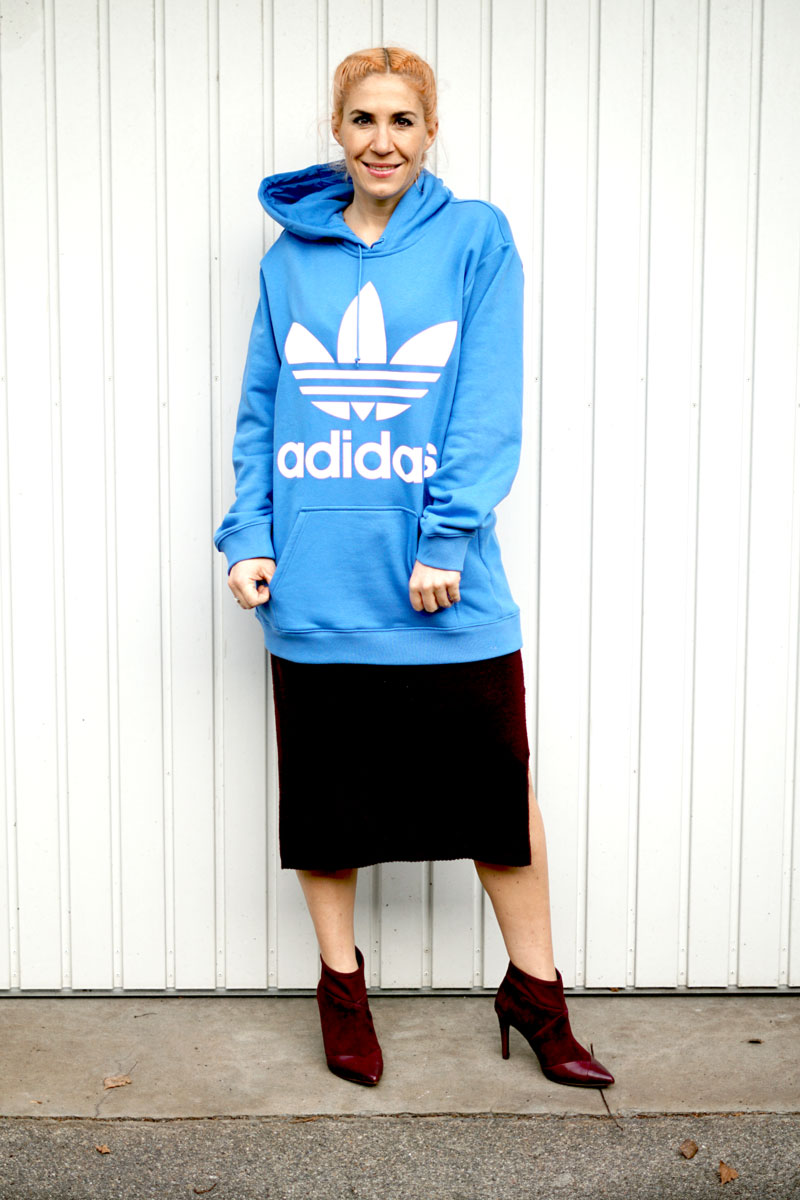 Zieht Euren Lieblings-XXL-Hoodie (oder denjenigen Eures Freundes…funktioniert auch fantastisch…) über ein Kleid an und verleiht dem Look mit sexy Heels Extrawürze. Der Look ist sportlich, feminin, sexy und unglaublich trendy. Er funktioniert wunderbar zum Einkaufen, ein Dinner mit Freundinnen oder wieso auch nicht für eine Fashionweek?