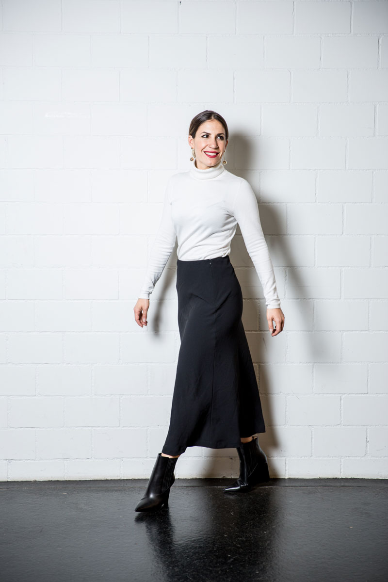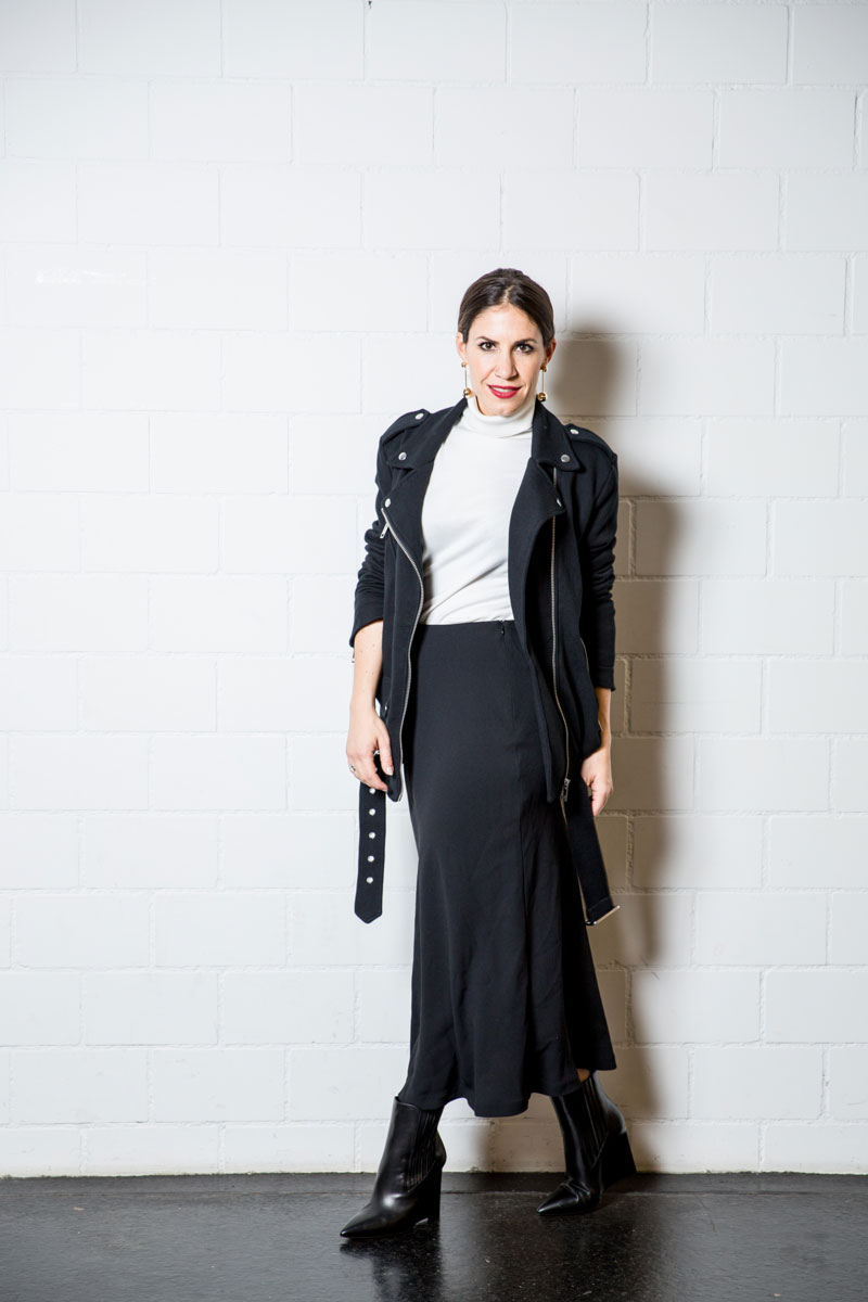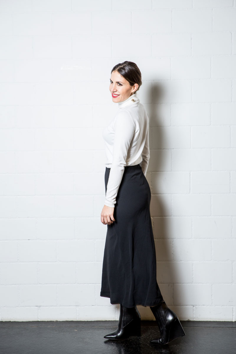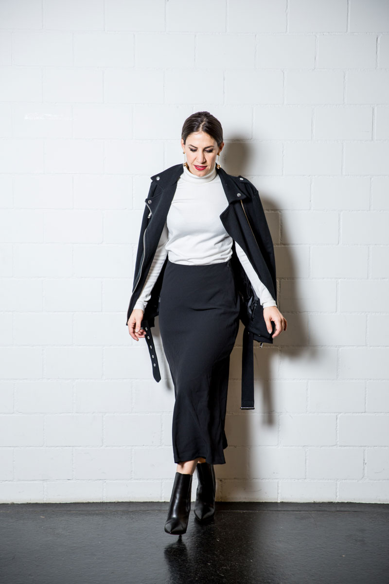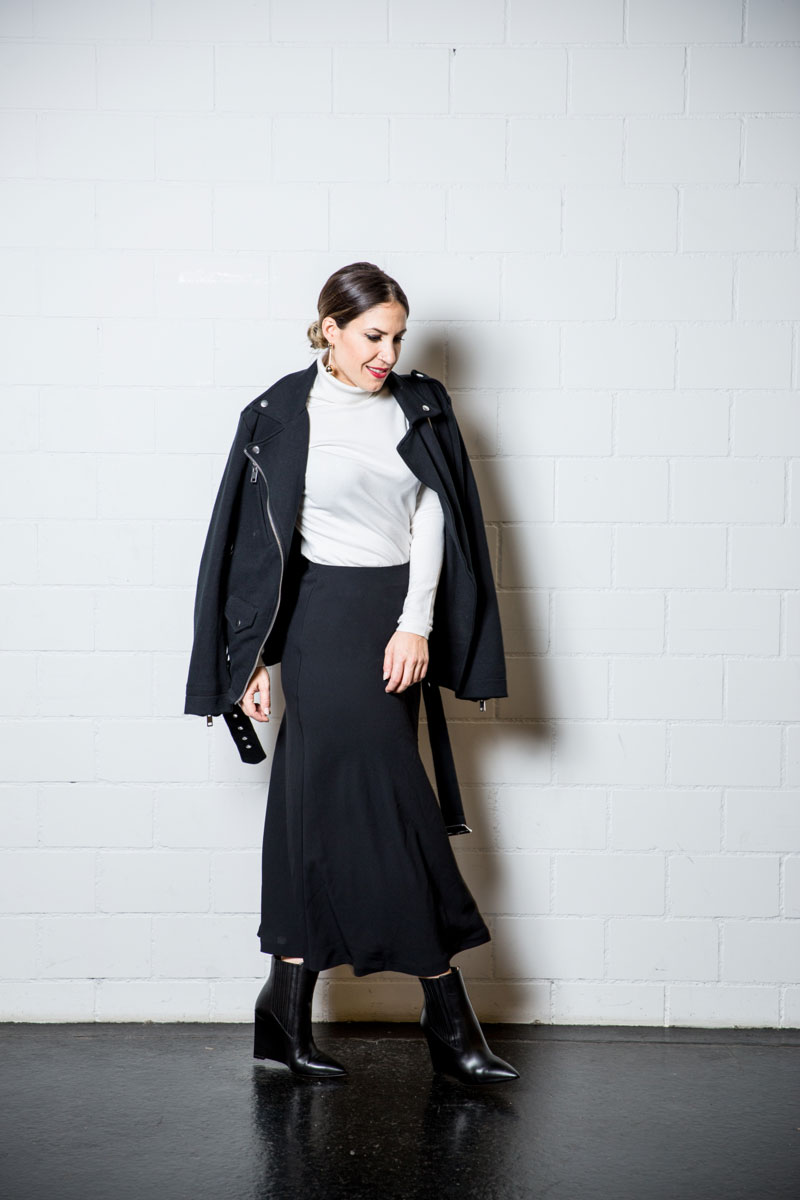 Ein schwarzer Maxi-Jupe, mit meinen Lieblingsstiefeln von Bally, einem weissen Rollkragenpullover und eine Baumwoll-Biker-Jacke, die dem Look eine Prise Coolness verleiht. Diese Diesel-Jacke ist momentan sowieso eines meiner Lieblingsteile, sie passt fast zu allem und verwandelt jeden Look in etwas Spezielles.