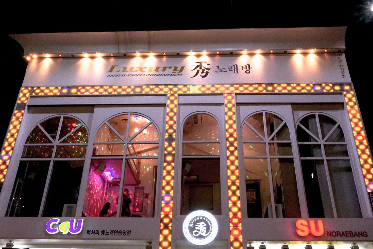 Karaokebars (auf Koreanisch „Noraebang“) sind in Korea hoch im Kurs. Das Luxury Su Noraebang ist eine der edelsten „Norae“-Locations, sie schaut aus wie ein überdimensionales Puppenhaus. Durch eine grosse Fensterfront können voyeuristische Passanten die wilden Norae-Parties verfolgen, aber nur optisch, denn der Gesang bleibt in den einzelnen schalldichten Räumen, die man alleine, zu zweit oder mit seinen Freunden mietet.