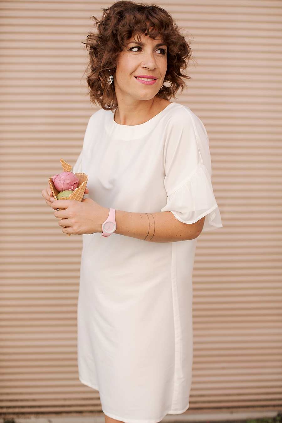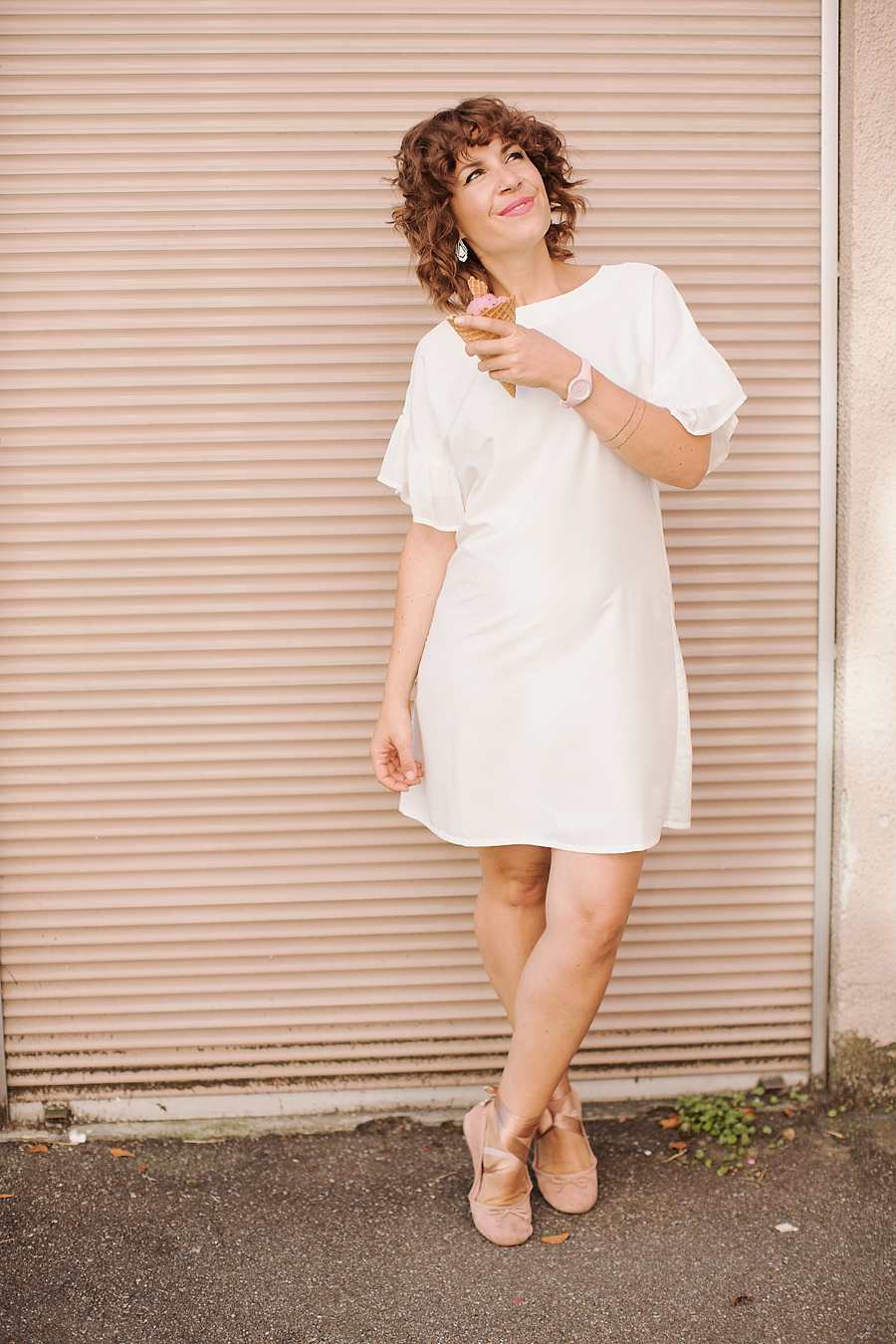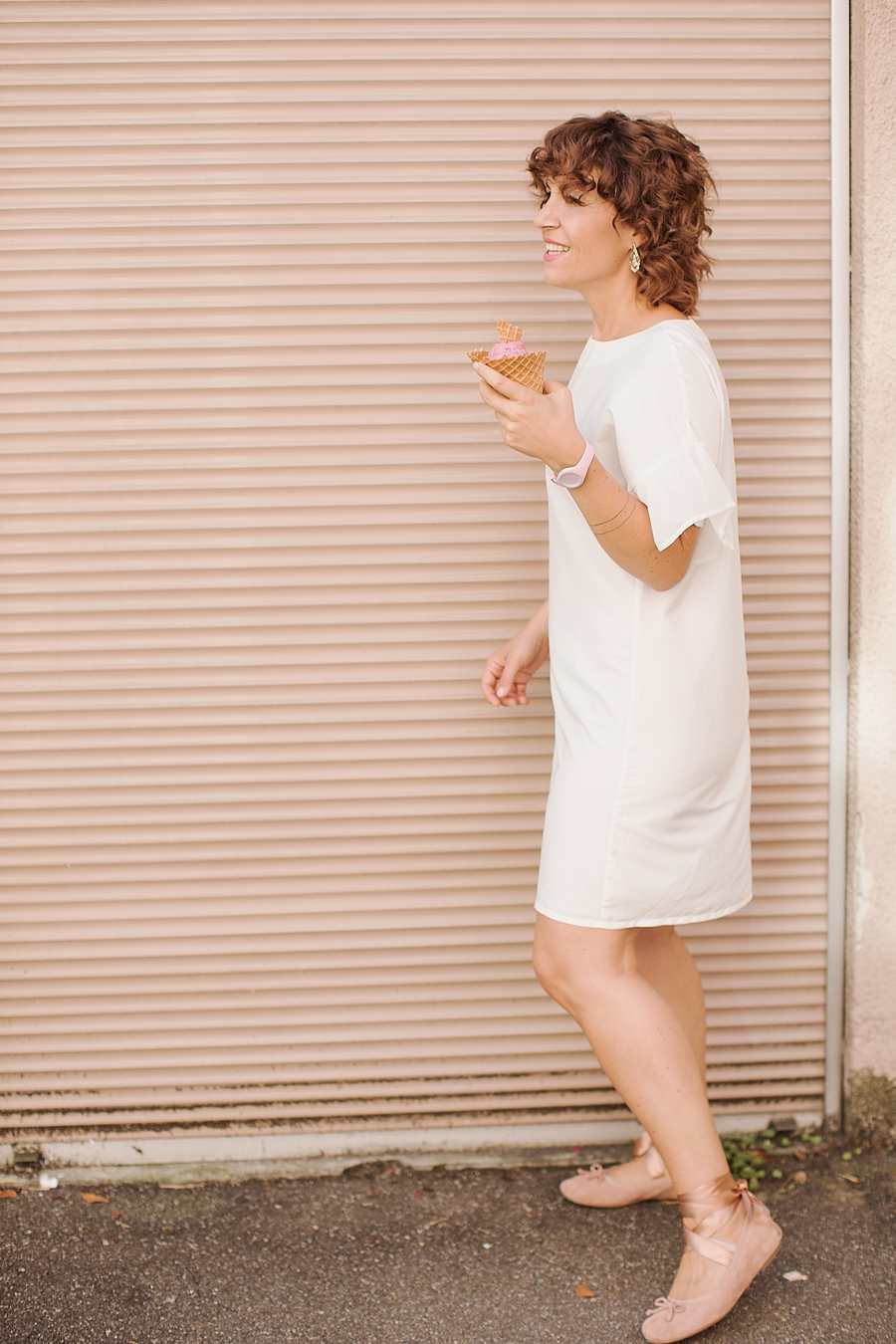 Sommer bedeutet für mich eine unschuldige Leichtigkeit, und das wollte ich mit diesem eifachen Look verkörpern. Er besteht aus einem lockeren Blusenkleid von Blanco, einem Paar „ich-wäre-ja-so-gern-eine-richtige-Ballerina“-Ballerinas von Unisa und meiner bonbonfarbenen Uhr von ice watch.