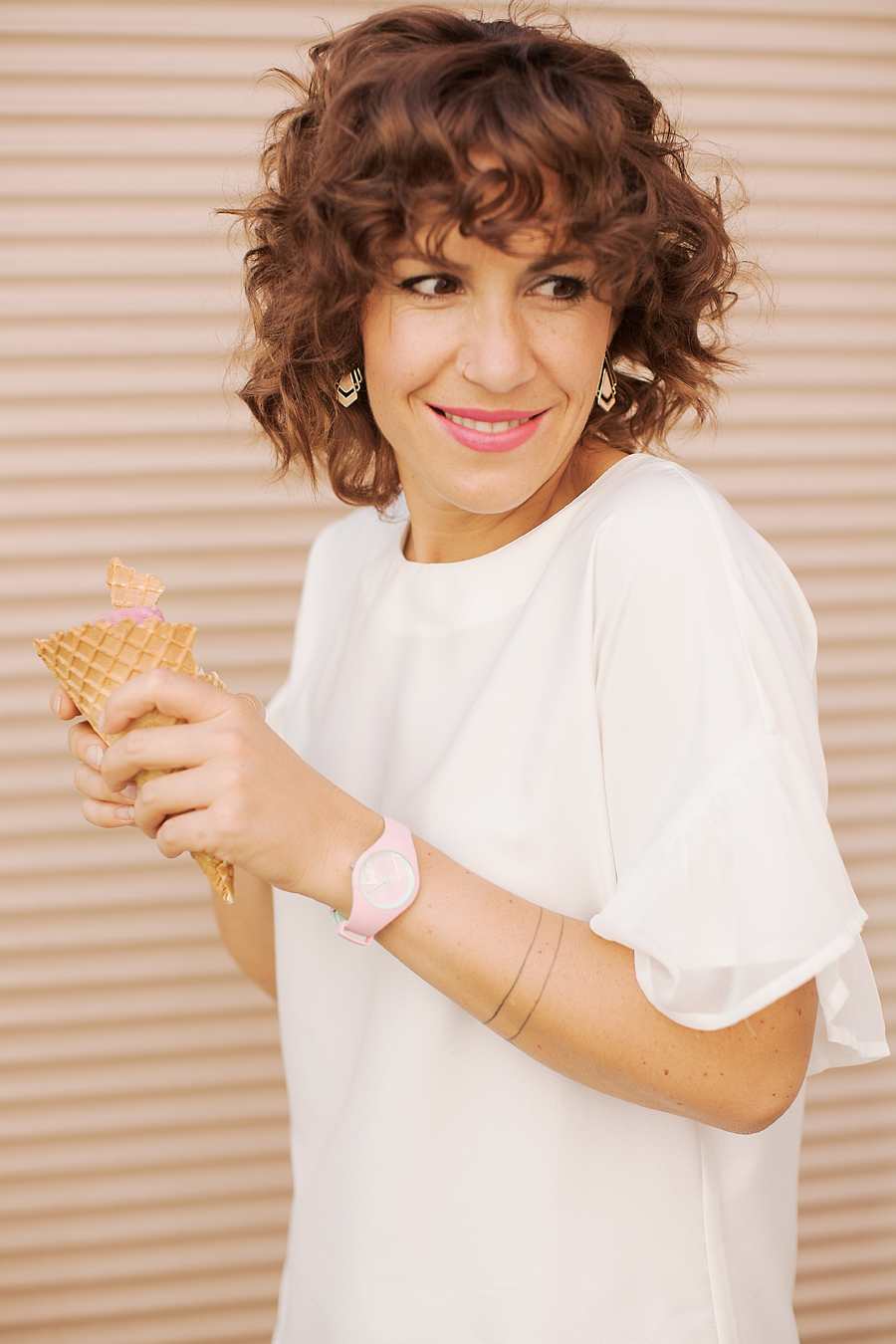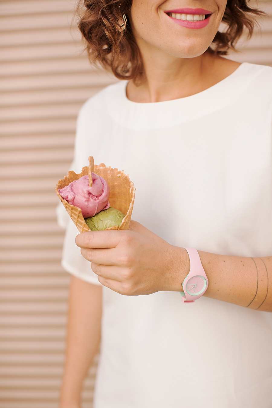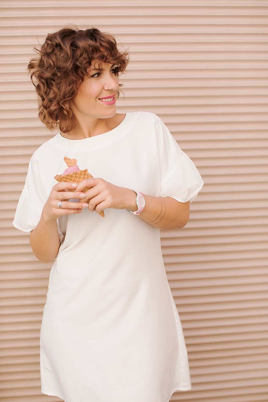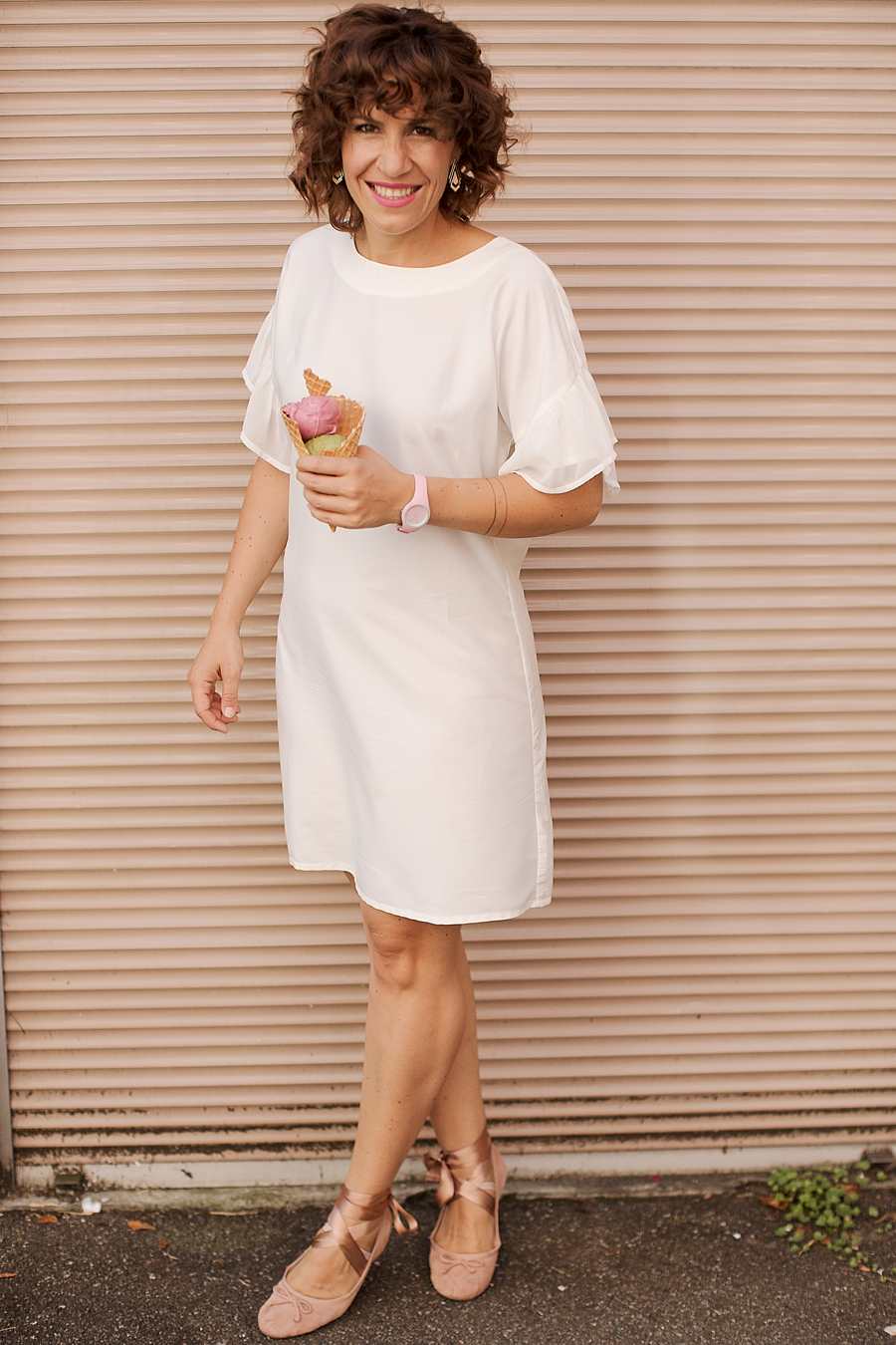 Sommer bedeutet für mich eine unschuldige Leichtigkeit, und das wollte ich mit diesem eifachen Look verkörpern. Er besteht aus einem lockeren Blusenkleid von Blanco, einem Paar „ich-wäre-ja-so-gern-eine-richtige-Ballerina“-Ballerinas von Unisa und meiner bonbonfarbenen Uhr von ice watch.